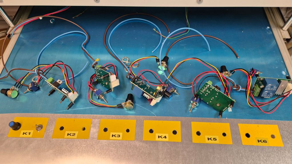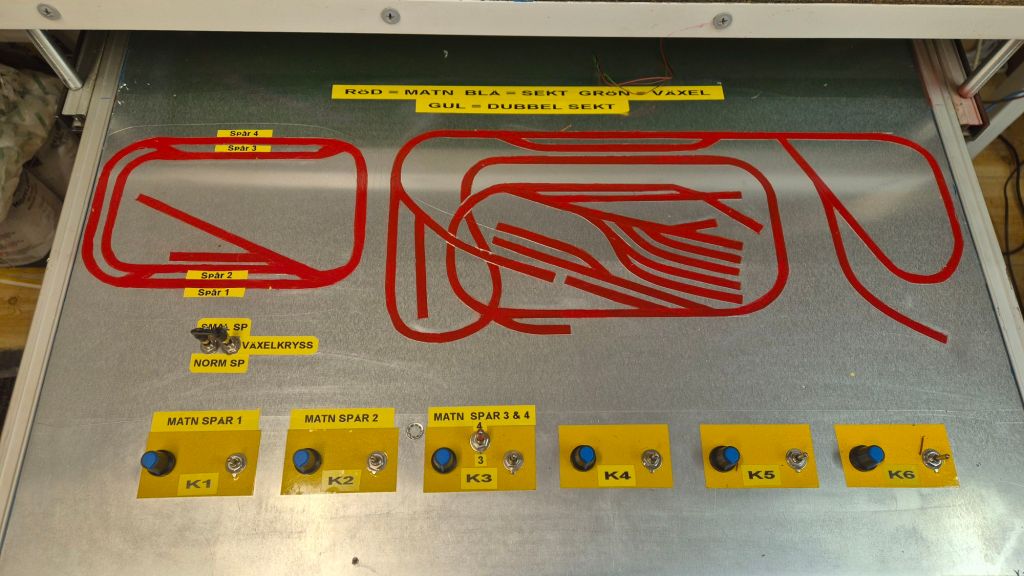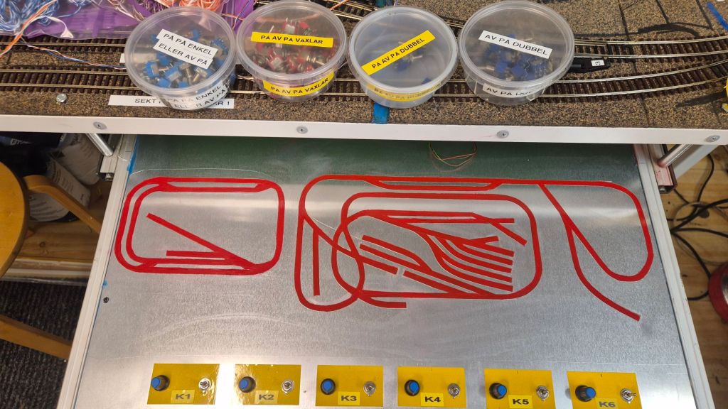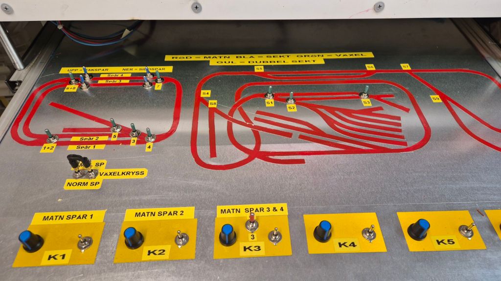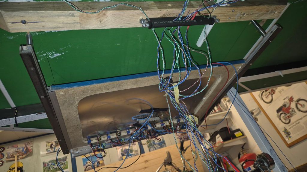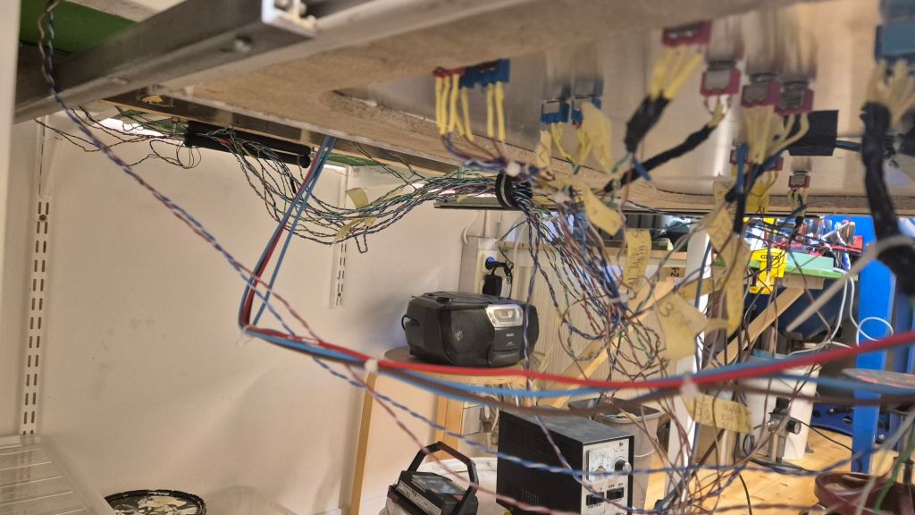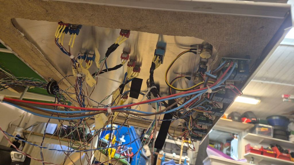 På bilden så ser det inte ut att vara så mycket kablar, men varje ”kabel” innehåller 5-6 st mindre kablar. Under kabeldragningen, och allt evigt lödande och på med krympslangar, så måste längderna anpassas så att det utdragbara körbordet går att dra ut utan att kablar rycks loss. Buntning av kablarna kommer först när alla kablar är på plats och just nu är det inte ens hälften som är dragna. Sen måste ju ändarna kunna snacka, vippar jag på en microbrytare så ska rätt växel läggas om, och det är ett evigt testande och justerande just nu. Körbordet har nu fått en del av brytarna på plats.