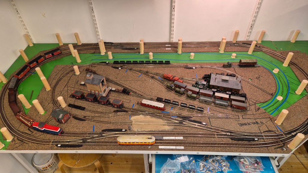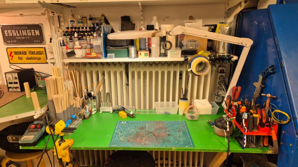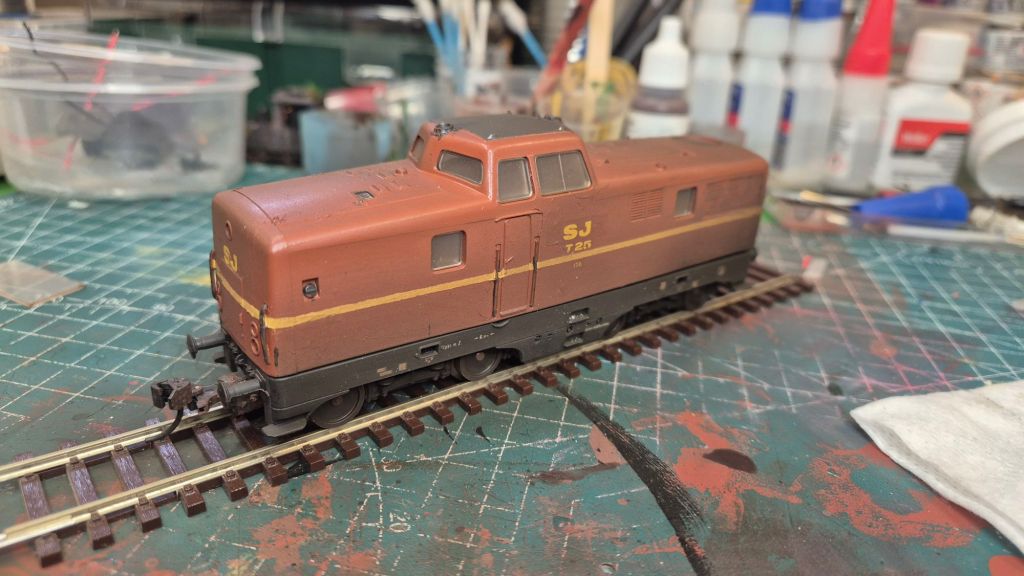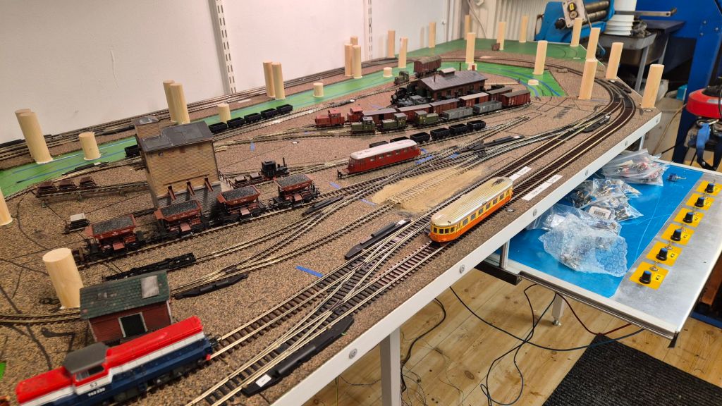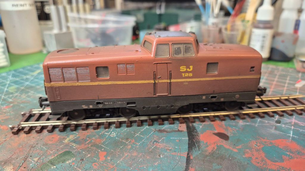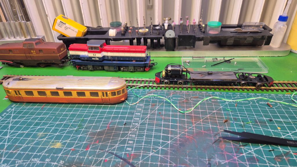 På byggbordet står just nu rälsbussen som kommer att passera Dyberg på stambanan några gånger om dagen. Den är lite låghalt och går inte helt ok, så felsökning pågår och viss vädring är utförd. Tyvärr så är det samma sak med Limas gamla T43:a, trots motorbytet till en modernare borstlös motor så går det inte att krypköra, så det är lite felsökning även där.